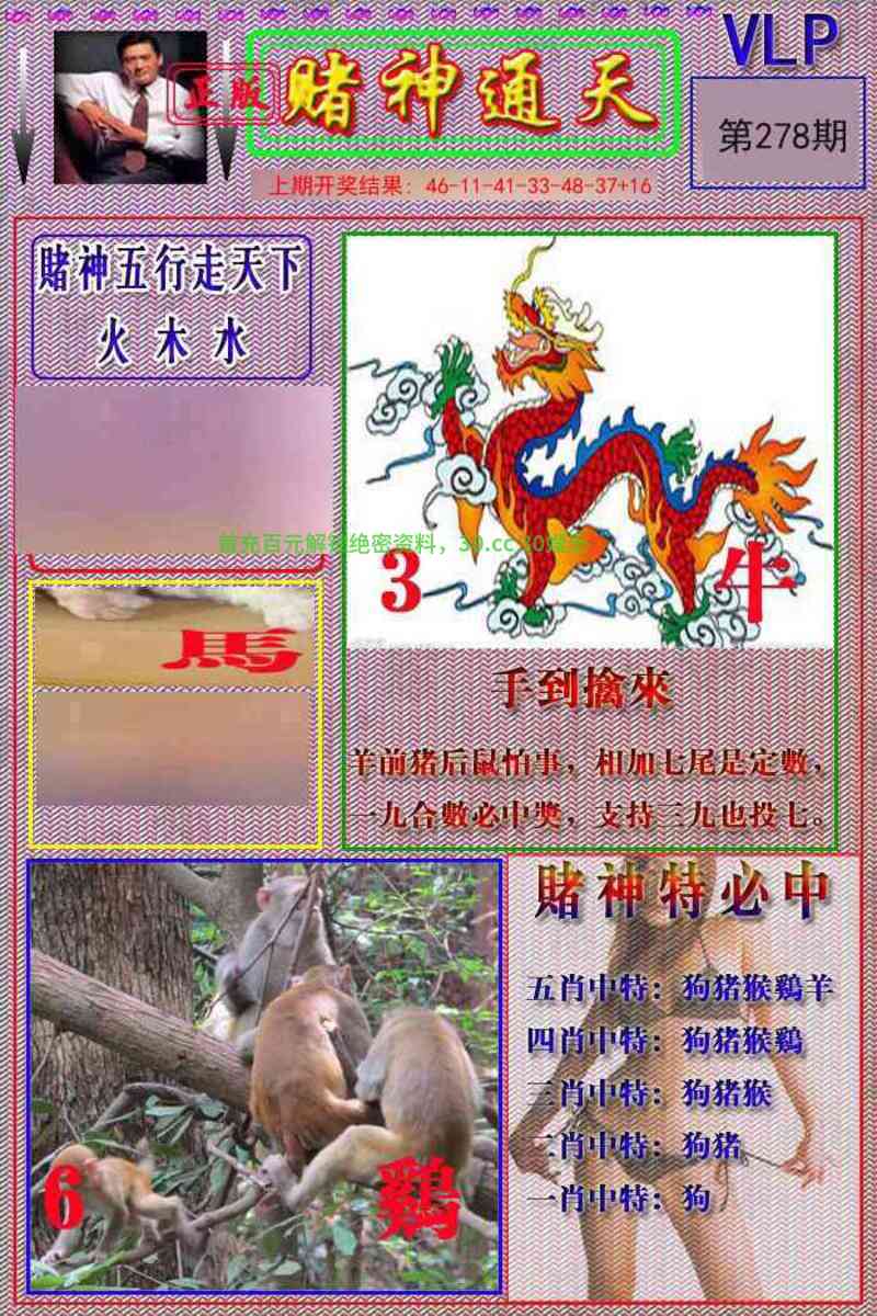 274期:六肖 | 狗鸡蛇兔虎猴 | 开狗44准 |